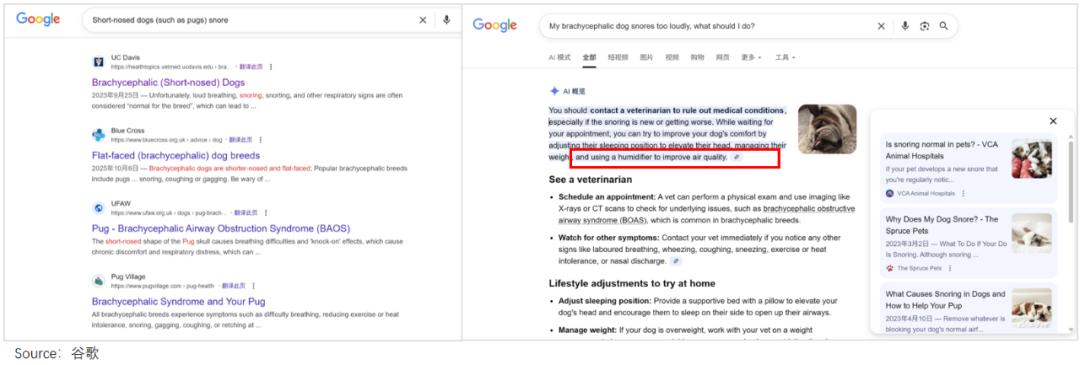 基于AI推理能力,搜索不再是“匹配关键词”,而是“理解用户场景和意图”,且更长的提问,也能帮助AI读懂用户。看一组对比就知道了:搜索“短鼻犬打鼾”,传统搜索引擎返回的是科普或宠物医院广告,AI还可能会将加湿器、降噪耳机等产品推荐给用户。