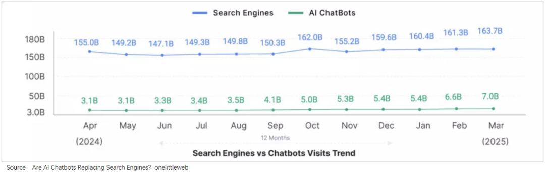 二者不是“你死我活”,而是互为补充,共同推高搜索体验的天花板。一份研究就显示,AI聊天助手流量爆发的时候,搜索引擎的体量并没有大受冲击。