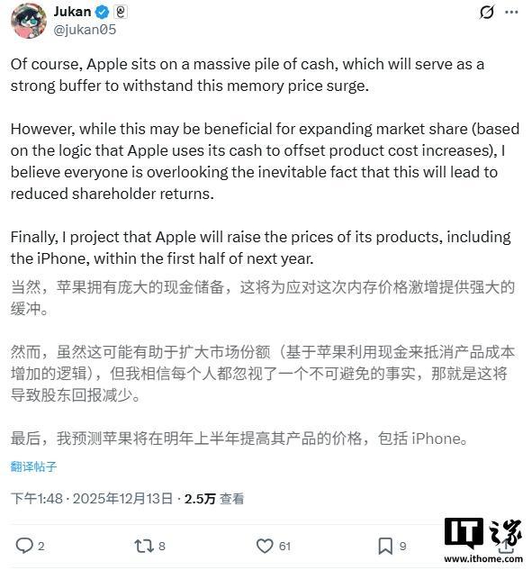 不过 @jukan05 也指出,苹果拥有规模庞大的现金储备,能够在短期内吸收部分成本压力;同时苹果还持续加大对自研芯片的投入,也有助于抵消部分成本上升,有望在一定程度上缓冲内存涨价对于整体带来的冲击。