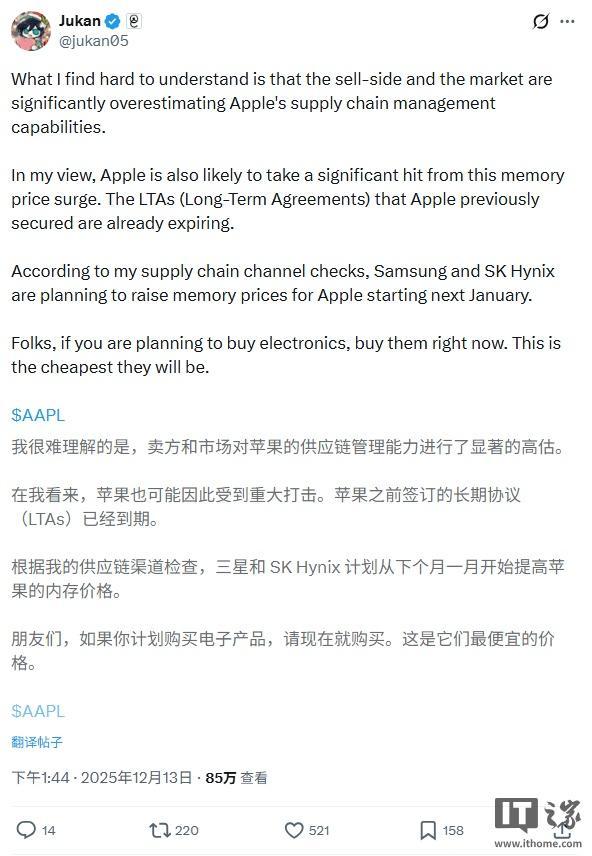 外界关注的核心问题在于,苹果是否会将由此带来的成本上升转嫁给终端消费者。@jukan05 认为,苹果很可能在 2026 年上半年上调包括 iPhone 在内的产品价格,以应对持续上升的零部件成本。