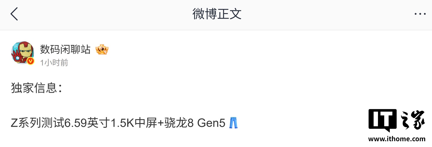 博主表示,这台手机将搭载高通骁龙 8 Gen 5(第五代骁龙 8)芯片,结合博主文中暗示与评论区猜测,预计为 iQOO Z11。
