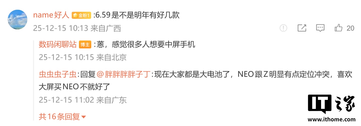 后续有用户在评论区询问:“6.59 是不是明年有好几款”,博主回复道:“蒽,感觉很多人想要中屏手机”。