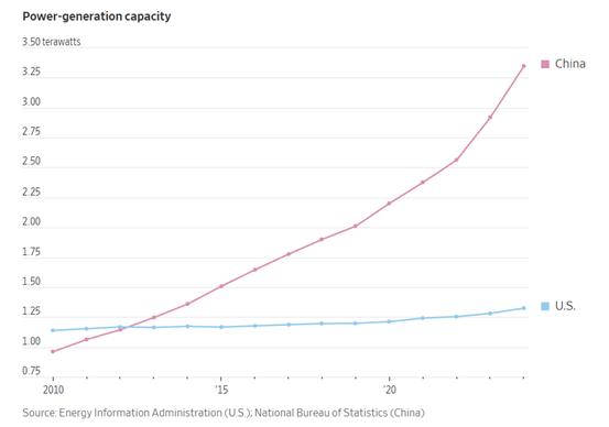 很多人都喜欢用这张图,中国电力生产量扶摇直上,美国却波澜不惊。