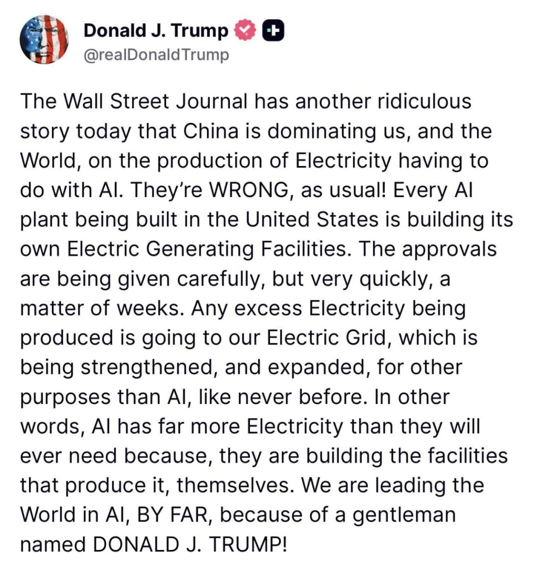 特朗普应该是被戳到了痛处,当天下午,他就在Truth Social上连发数条推文,称华尔街日报的报道“荒谬至极”、“完全错误”。他给出的反驳理由是:“美国每个正在建设的大型AI工厂,都会配备自己的私人发电厂,这些发电厂还会把多余的电力输送回国家电网。”