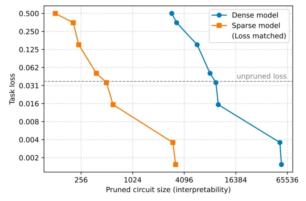 3、规模缩减16倍:对比实验显示,在相同的任务损失下,稀疏模型的电路规模比密集模型小了16倍。这意味着解读AI思维的难度降低了整整一个数量级。
