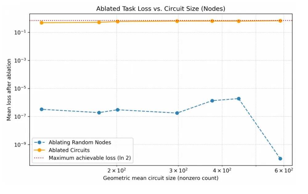 为了验证这些电路的真实性,团队进行了“均值消融”实验。结果证明,移除非电路节点对任务几乎没有影响,而一旦移除电路中的关键节点,模型性能就会瞬间崩塌。这证实了这些电路确实是模型执行任务的“必经之路”。