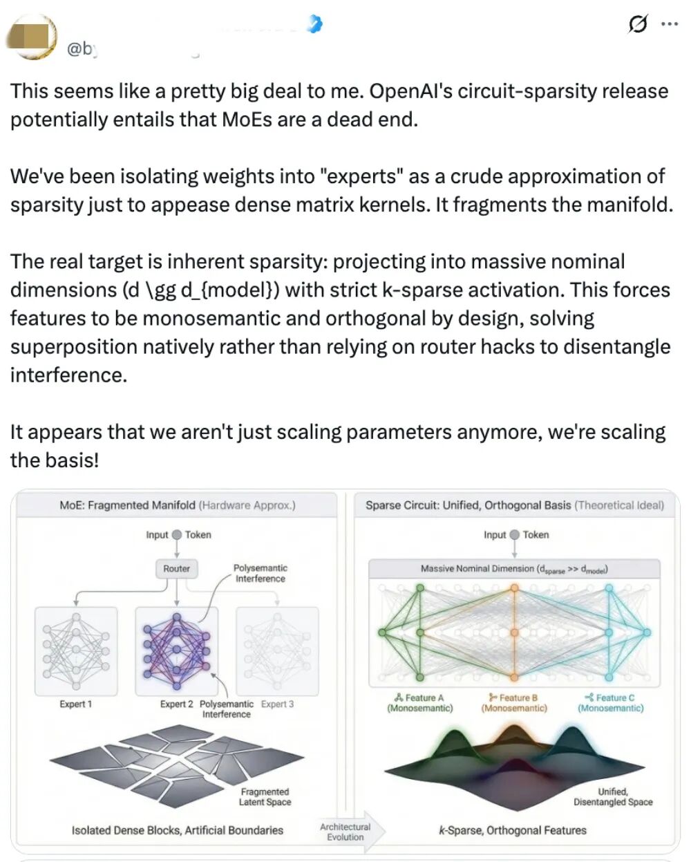 但有些网友却不这么认为,称其没有看出MoE模型为何会因此走到尽头,并进一步解释说这一技术是针对XAI(可解释AI)的,它的训练成本要高100-1000倍,回到“研究时代”并不意味着让事情变得更复杂。