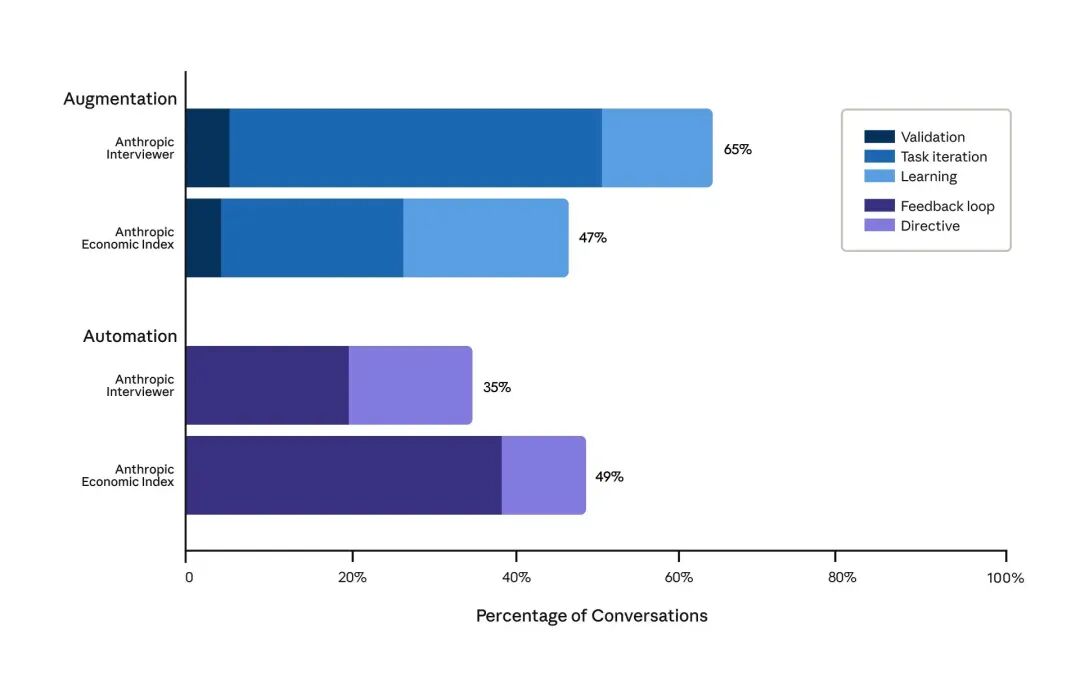 但Anthropic对Claude使用记录的分析显示,更大比例的使用其实是自动化——把任务直接交给模型完成,然后再自己稍作调整。