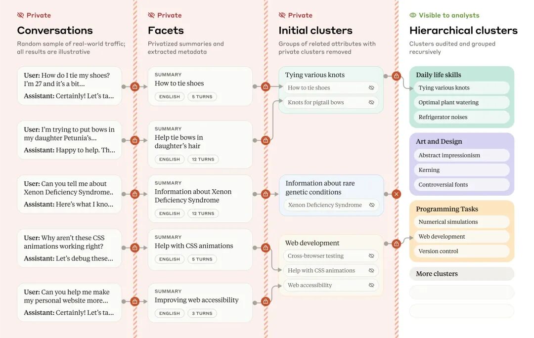 Anthropic的自动主题聚类工具Clio。用虚构的对话示例来说明Clio的分析步骤概述