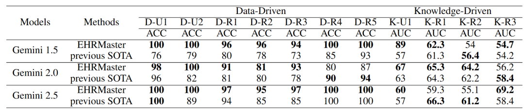 EHRMaster 与 Gemini 联合,使 LLM 处理结构 EHR 的性能全面超越 SOTA 模型。研究成果已被 AAAI 2026 Main Technical Track 录取为 Oral 论文。