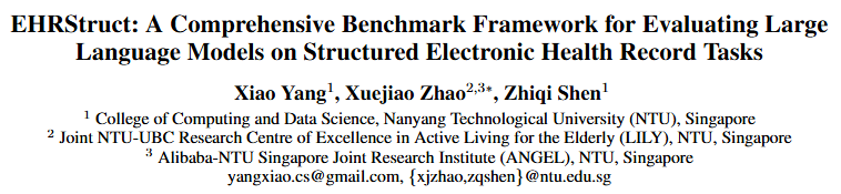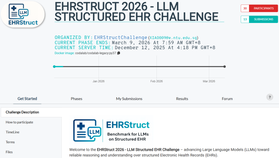 同时发布的还有 EHRStruct 2026 - LLM 结构化电子病历挑战赛(EHRStruct 2026 - LLM Structured EHR Challenge),旨在为研究者提供一个统一、严谨且可对比的 LLM 处理结构化 EHR 能力的评测平台,可直接作为论文实验结果的标准基准。