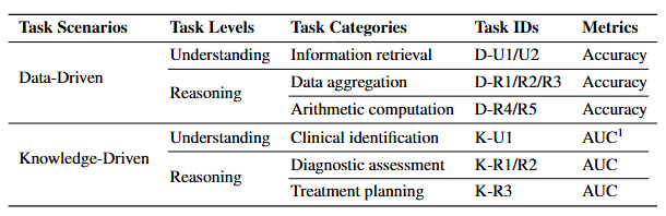 其中,临床识别和治疗规划在结构化环境中的研究相对欠缺,但在非结构化 EHR 工作中十分常见,且具备重要的实践意义,因此在专家建议下被纳入任务体系。