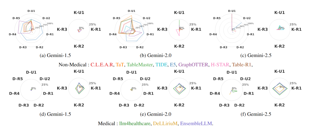 研究人员复现并评估了 11 种代表性 SOTA 方法,涵盖 8 种通用非医疗模型与 3 种医疗专用模型,结果揭示了显著的性能割裂:通用方法擅长数据驱动的逻辑与数值推理,但在临床知识任务上表现平平;反之,医疗方法虽精通疾病预测等知识驱动任务,却难以泛化至通用数据场景。