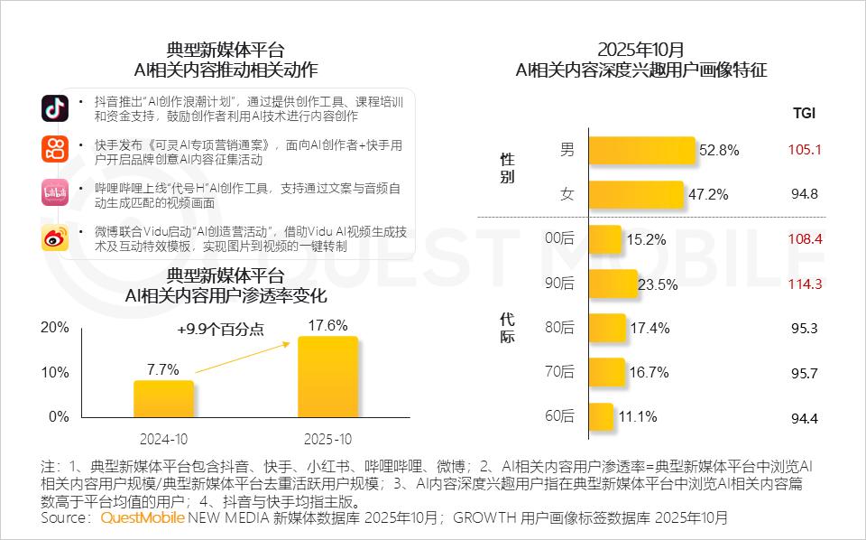 QuestMobile数据显示,2025年10月AI相关内容用户渗透率同比增长9.9个百分点,且深度兴趣用户呈年轻化、男性略多特征。