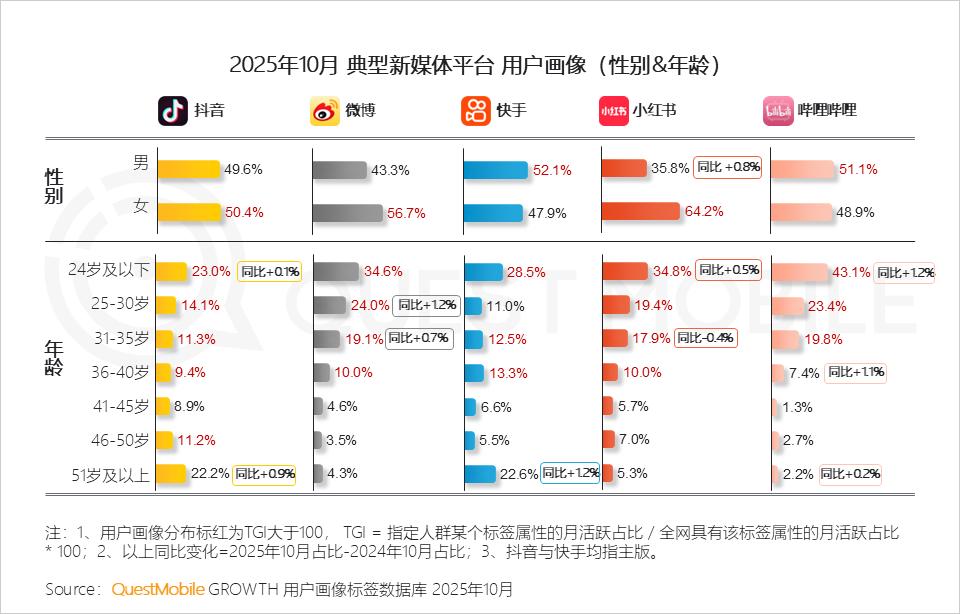 具体来看,各平台间差异化竞争格局已经相对稳定:短视频、长视频社群、资讯社区各有用户圈层。2025年10月,微博、小红书、哔哩哔哩30岁以下用户占比分别为58.6%、54.2%、66.5%,年轻化特征非常明显,相比之下,抖音、快手51岁及以上用户占比分别达到22.2%、22.6%。