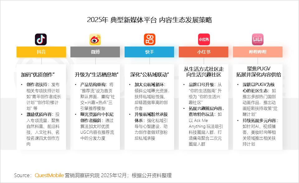 哔哩哔哩、小红书持续从垂直社区“破圈生长”,拓宽内容与用户边界;而抖音、快手则从全民应用转向“精耕细作”,从流量到“留量”,微博从“看热点”的地方,变为“过生活”的地方,其共同目标是构建一个更具活力、更可持续的内容与商业生态。