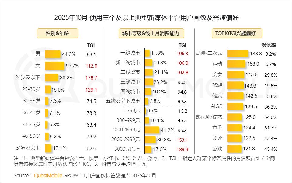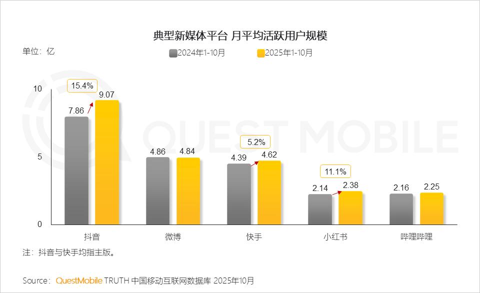 QuestMobile数据显示,截止到2025年10月,典型新媒体平台APP去重活跃用户规模及月人均使用时长分别为11.49亿、3367.5分钟,同比分别增长了7.3%和5.4%,显示出在多元化内容形态和算法推荐技术加持下,新媒体平台用户粘性仍在稳步提升。