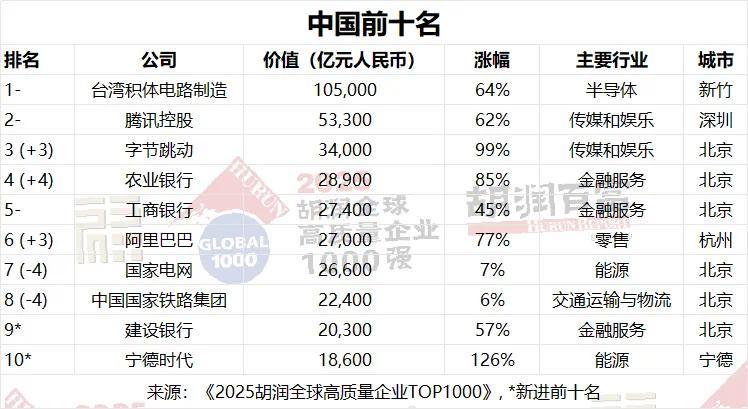 凤凰网科技讯 12月16日,胡润研究院在深圳福田发布《2025胡润全球高质量企业TOP1000》。得益于人工智能芯片和数据中心计算需求的激增,英伟达超越微软和苹果,成为全球价值最高的公司,价值32.8万亿元人民币,增长49%。苹果以28.6万亿元人民币的价值稳居第二,增长23%。去年排名第一的微软以26.9万亿元人民币的价值跌至第三,但价值增长13%,反映了其云业务和企业业务的稳定发展势头。而中国价值最高的三家公司分别是台积电、腾讯、字节跳动。