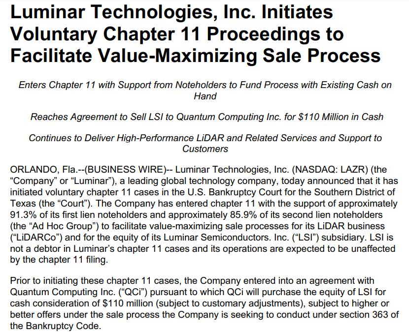 在文件中,Luminar宣布已根据《破产法》第11章启动破产程序,计划出售核心资产,重组债务。