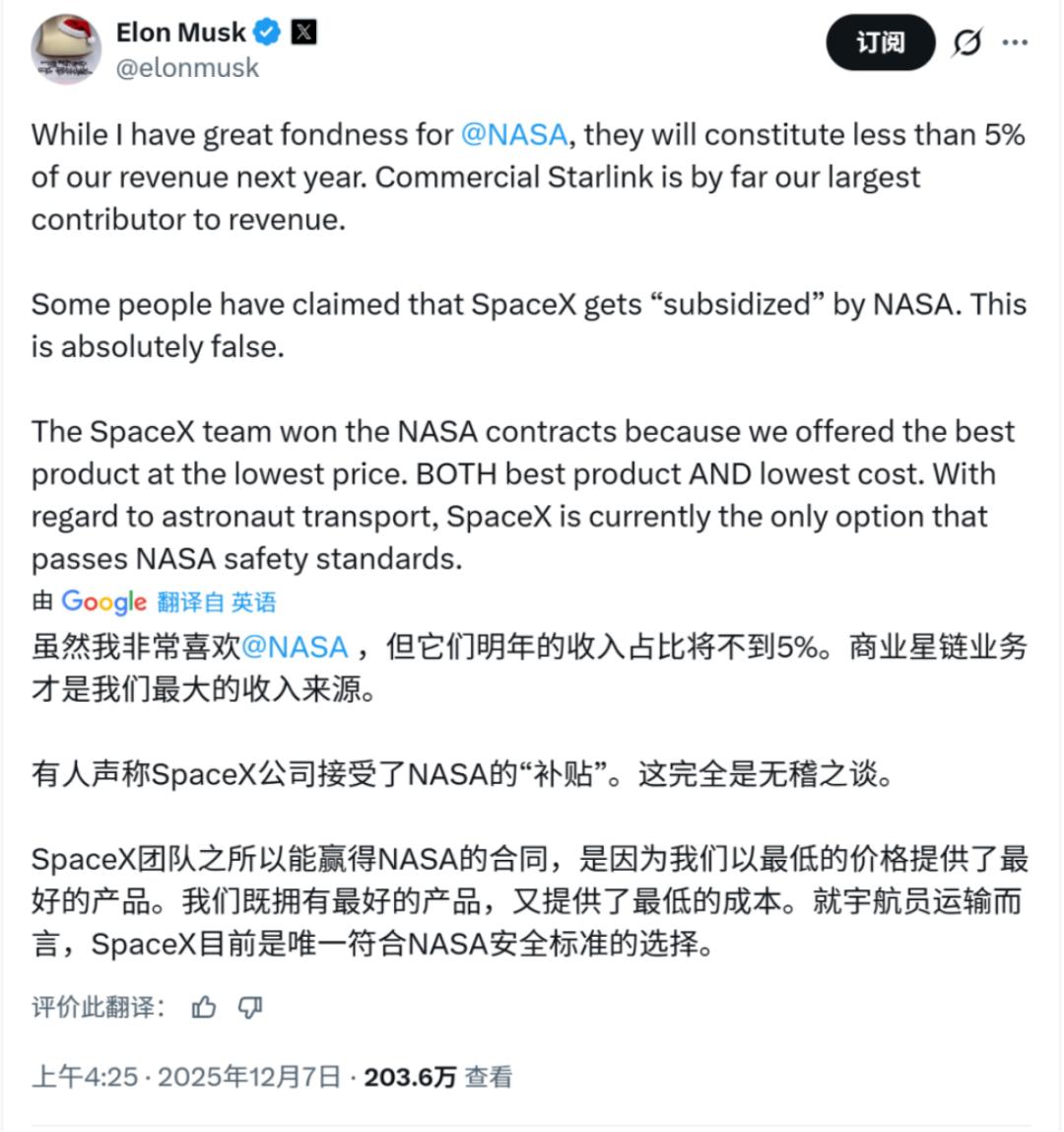 不过,马斯克最近在推特中就反驳了靠和NASA关系获得订单从而支撑业务的说法,而且他提到2026年NASA给的订单只占总收入的5%,最关键的还是商业星链业务。