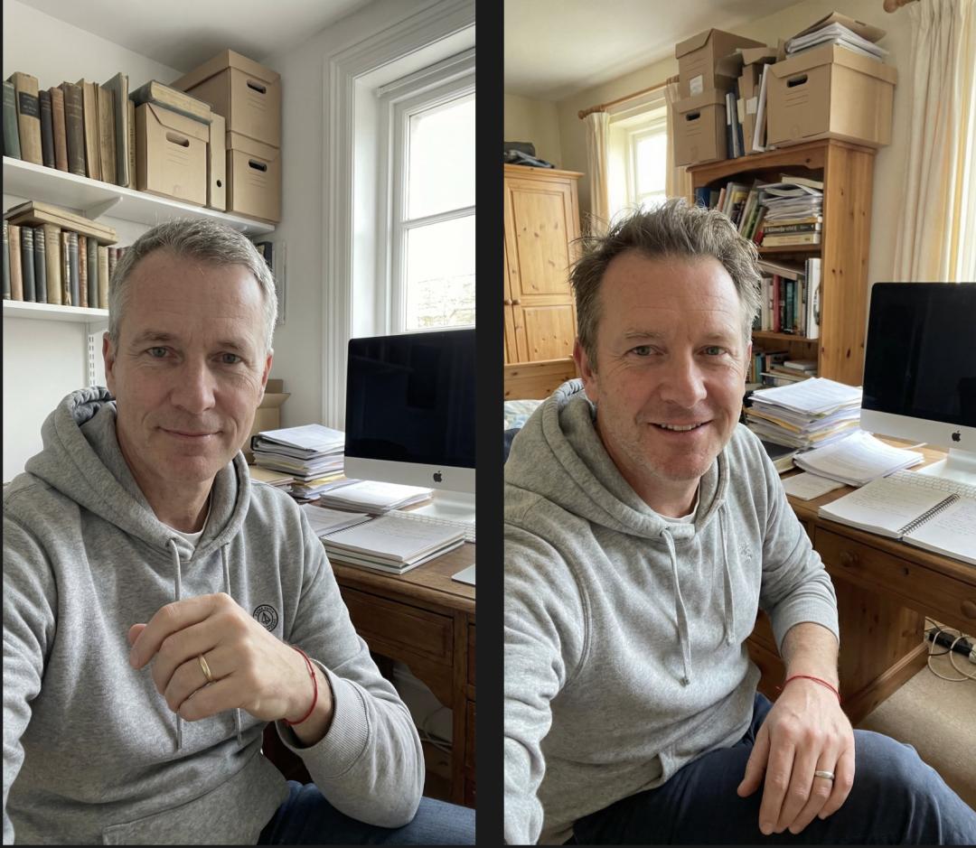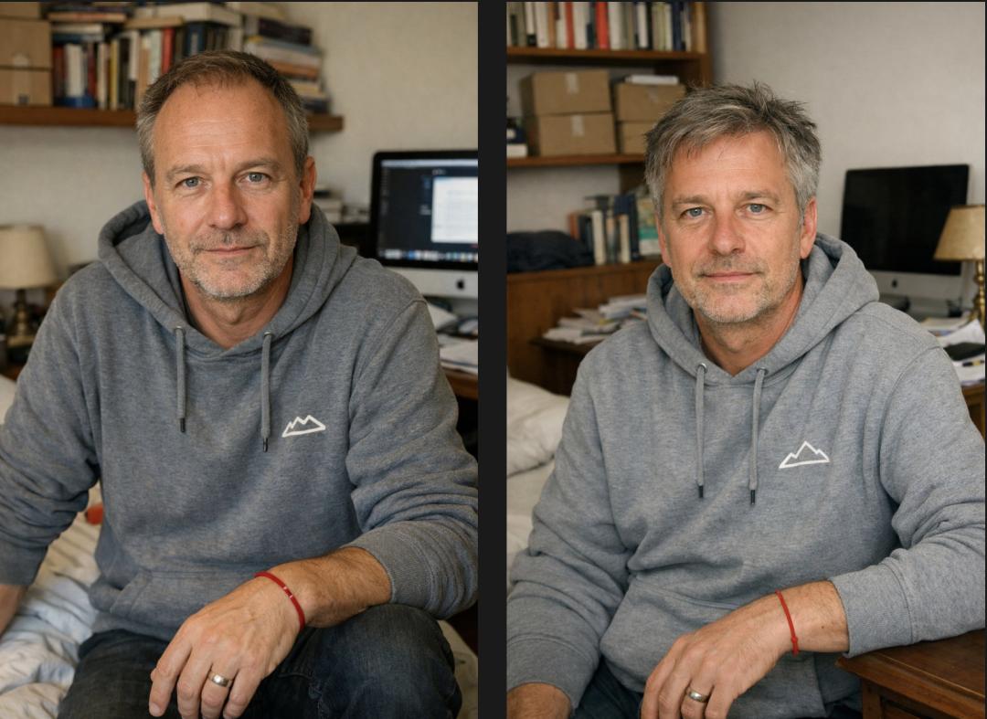 提示词:53岁白人德国男性在卧室中,典型的意大利风格卧室,架子上堆着箱子和书籍,背景处有一张书桌,上面摆着 iMac 和散落各处的纸张,身穿灰色连帽衫(带简约 logo),戴着婚戒,手腕上有一条低调的红色手链,直视镜头,自然随拍的用户原创内容风格