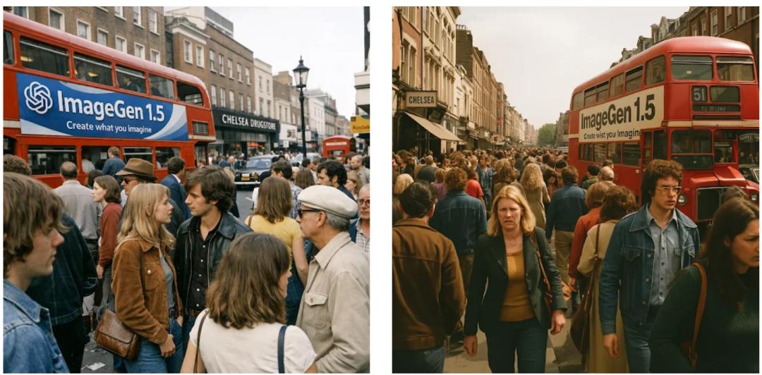 Prompt:做一个1970年代伦敦切尔西的街景,要那种照片级的写实,全焦,纤毫毕现。街上人山人海,还要有一辆公交车,车上有个广告写着「ImageGen 1.5」,再加上OpenAI的标和副标题「Create what you imagine。整体风格要超写实的业余摄影,就像iPhone随手拍出来似的……