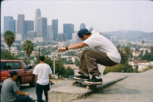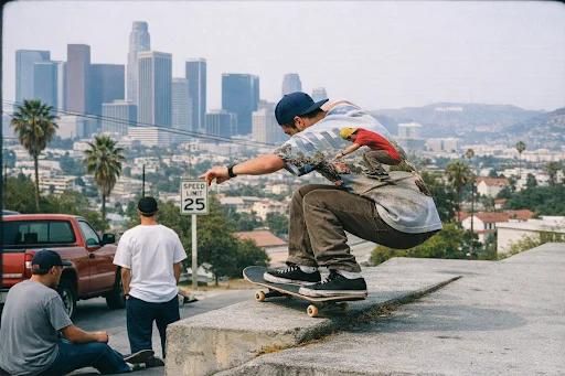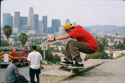 再以滑板运动为例,让ChatGPT生成一张洛杉矶风景滑板拍摄,90年代末纪实街头摄影风格。