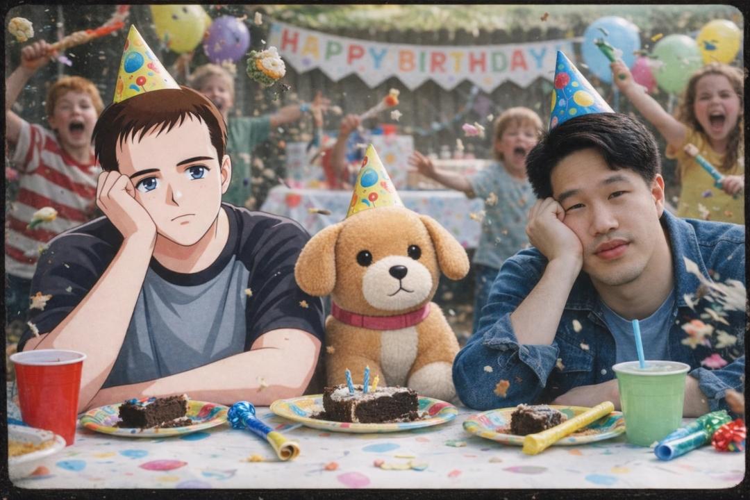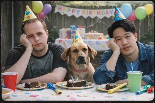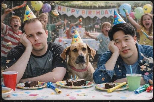 Prompt:做一张00年代胶片感的照片,把这俩男的和狗都合成进去,拍他们在小孩生日会上那种一脸无聊的样子。