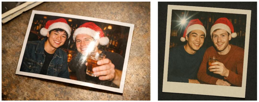 Prompt:做一张图,图里要有一张打印出来的复古老照片。照片上有一年轻亚裔男的和一年轻白人男,俩人在酒吧里都戴着圣诞帽,其中一个手里还拿着酒。那张打印照片上得能看见相机闪光灯留下的反光点。照片还得带个那种可见的细白边儿,并且稍微歪着点放。
