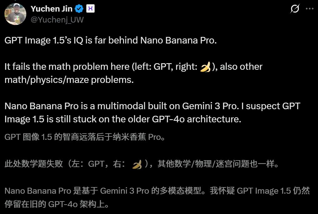 在Yuchen Jin的对比中,GPT的生图能力基本上能达到谷歌NBP的水平,但智商却惨遭碾压。