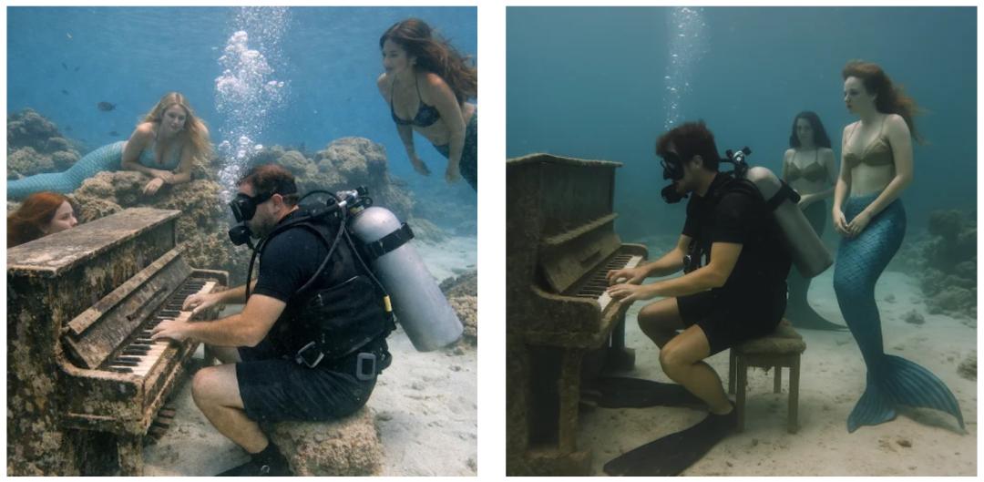Prompt:一个潜水员在水底下弹钢琴,旁边有美人鱼围观。超写实的业余拍摄风格。