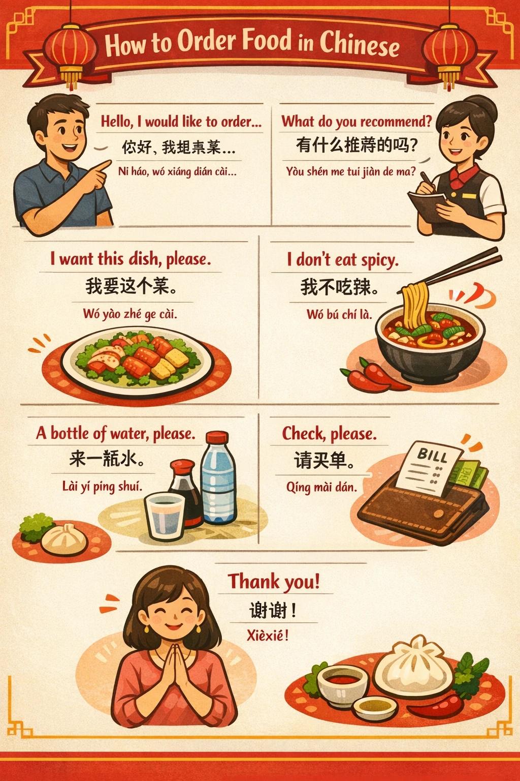 Prompt:能不能画张图,上面列点用中文点餐的基本常用语。