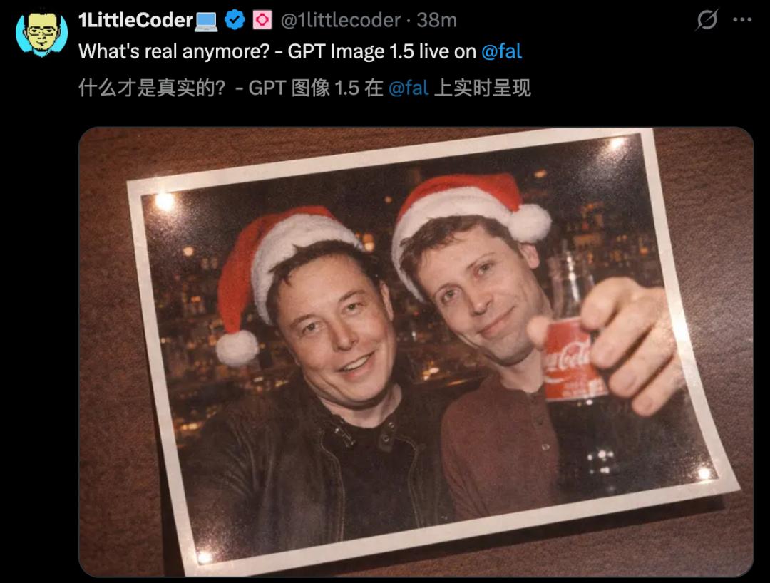 不过,也有网友表示,GPT Image 1.5生成的「马斯克和奥特曼圣诞合影」,逼真到完全看不出一丝破绽。