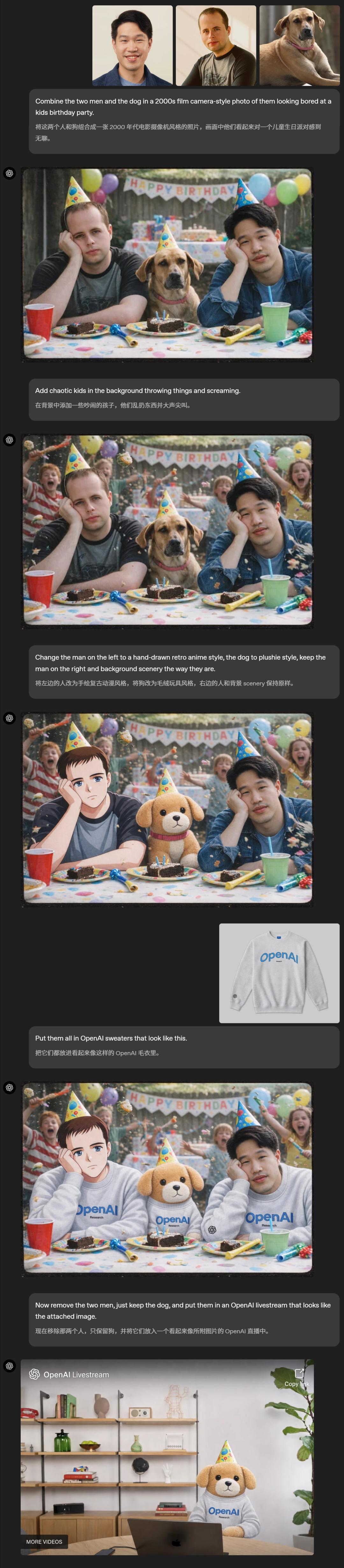 Prompt:现在把那俩男的去掉,只留那条狗,然后把它放到一个OpenAI直播画面里,就跟附图长得差不多的那种