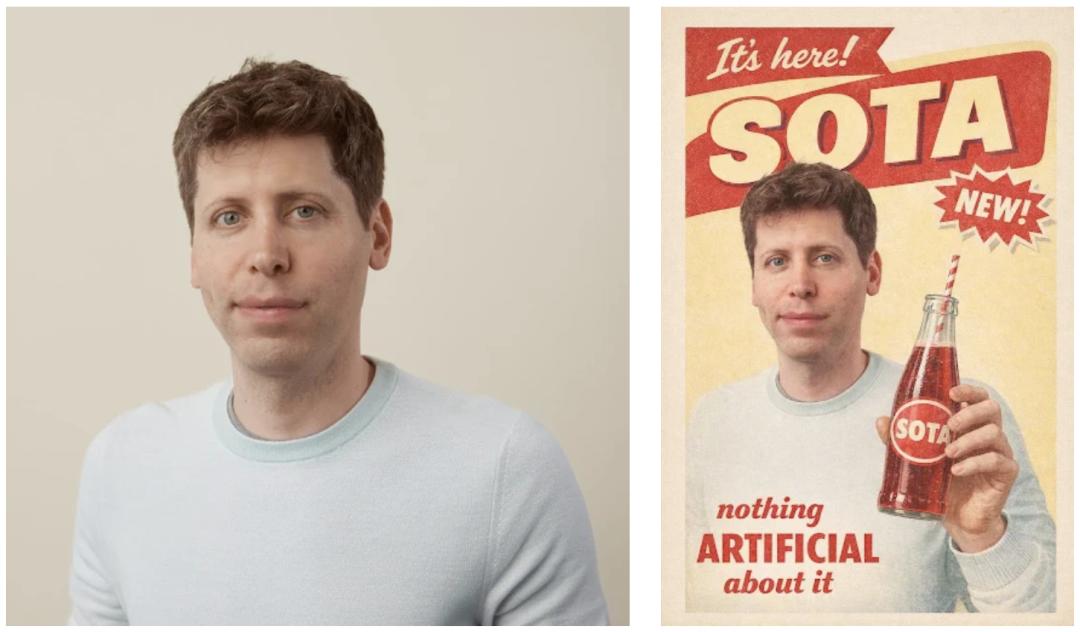 Prompt:用附件里这个男人的脸,为一个叫「SOTA」(一种新苏打水)的新饮料做一个复古汽水广告。口号写:nothing artificial about it(纯天然,无人工)。风格要忠实还原那个时代。