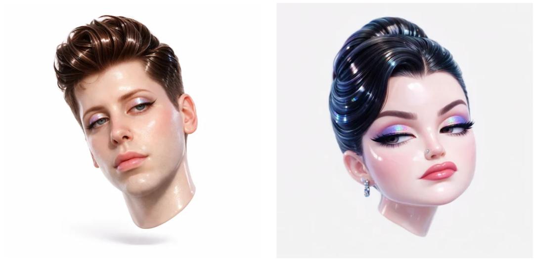 Prompt:做一个超风格化的3D漂浮人头,要把主角做成那种娇蛮、迷人、一脸不爽和无感的版本:半眯着眼、挑眉、嘴角轻微上扬,透着经典的「刻薄辣妹」范儿。皮肤要是光滑的亮胶质感,颧骨和鼻头打上强高光,捕捉柔和的影棚光。眼影要全息偏光的,从紫到青渐变,带清晰的反光点。头发要浓密、顺滑、油亮,做成雕塑感的大波浪或者利落的盘发,像抛光亚克力一样反光。加个金属铬的小鼻环(钉或环),带点拉丝金属反光。人头要悬浮在纯白中性背景上,倾斜15度,就像高级产品渲染图那样。用明亮漫射的影棚光,不要硬阴影,强调光泽感、塑胶感和次表面散射,做出来的深度要逼真。情绪要娇蛮、时髦、冷酷抽离。机位要特写肖像,正视镜头,85mm焦段。材质要那种超平滑、高光泽、卡通风格的塑料感皮肤、嘴唇和头发。