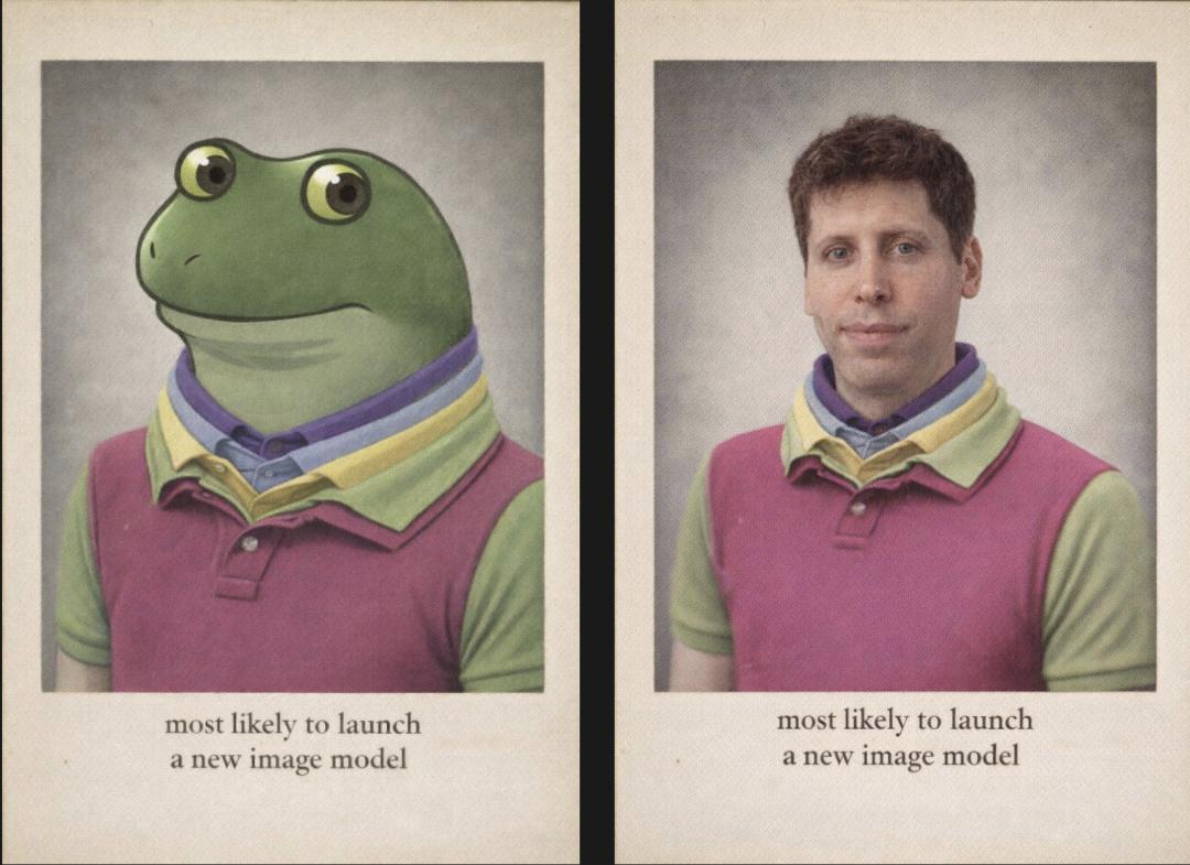 悲伤蛙或佩佩蛙(左),整体上高度模仿OpenAI的预热图(右)——相同的背景,相同的文字,相同的眼神,类似的服饰