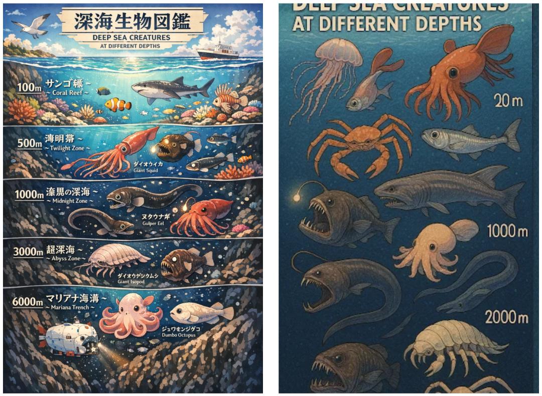 比如,日漫风展示海洋不同深度的生物剖面图,新(左)细节更多,但风格明显不如旧版(右)的更符合「日漫风」。