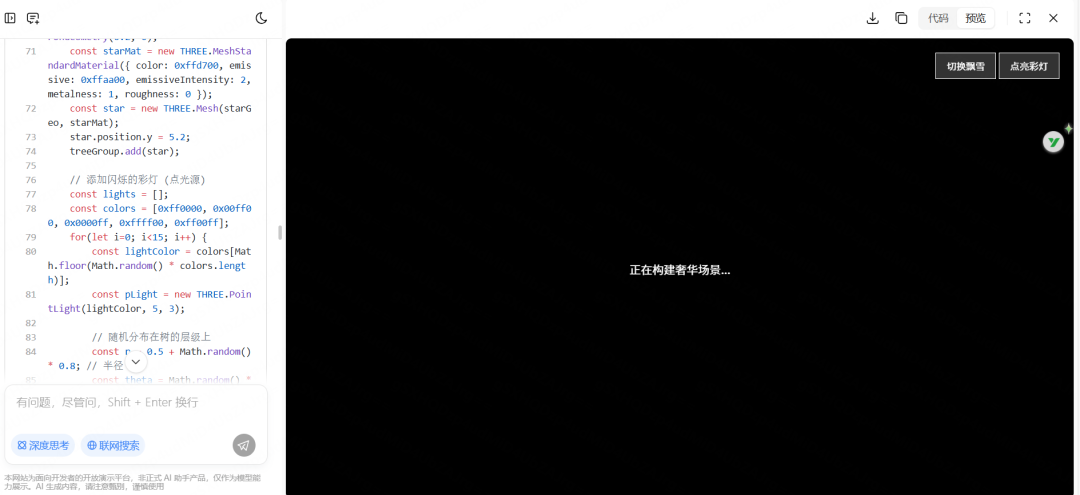 最后重点试了它的亮点功能——生成网页,我让它做一个“豪华互动圣诞树”的高保真3D网页,要求视觉效果拉满,但试了好几次都卡住了,生成不出来。