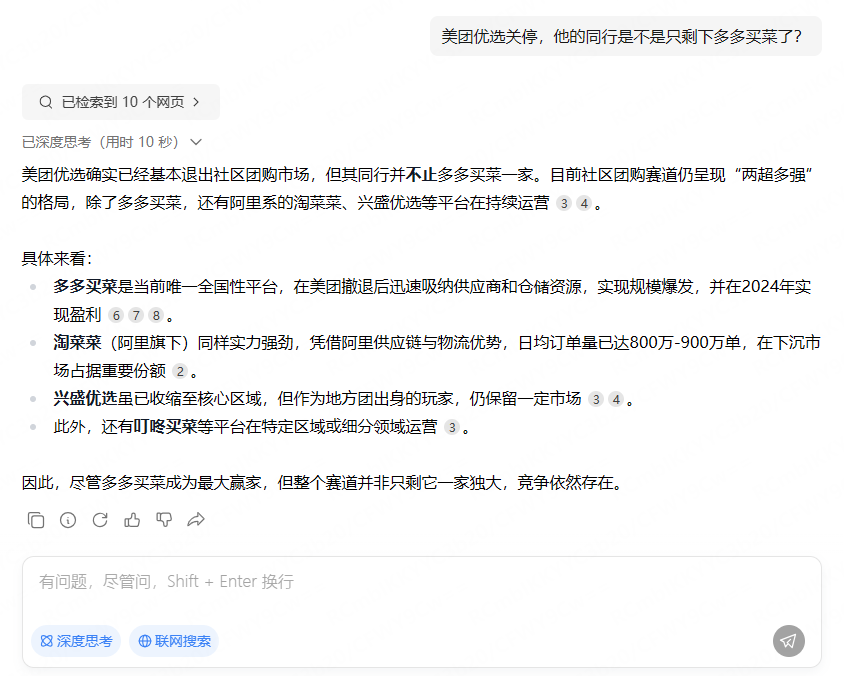 而千问用时5秒,DeepSeek-V3.2则需要10秒,三者给出的回答内容相差不大。