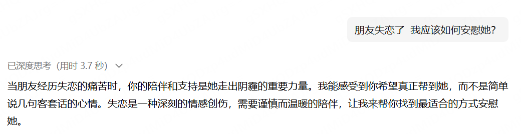 当被问及“朋友失恋了,我应该如何安慰她?”时,Xiaomi MiMo的响应速度最快,用时3.7秒。