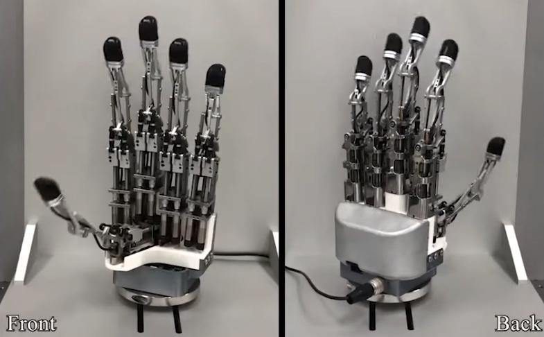 陶一伟:没错。连杆手实际上还有另外一条路线,也是高自由度的路线,就是之前韩国一篇论文叫ILDA,这篇论文的手基本上思路也是通过一个相对更复杂的连杆方式,把每个手指根部设计出三个主动的直线驱动器,然后通过也是比较复杂的连杆系统,实现每个手指三个自由度的方式。这样的手的确还是比较先进,但是它可能存在的问题是它的体积还是比较大,并且它的所有的零部件进行刚性的连接,使用中缺少一些柔性。这个柔性不仅在抓握物体的过程中感觉并不是非常的柔顺,并且它也会在碰撞的过程中相对来说更容易损坏一些。