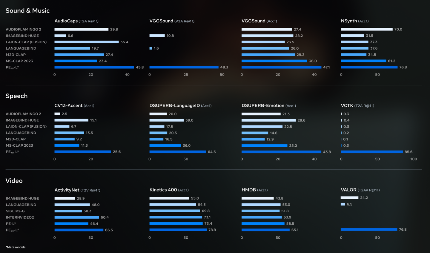 Meta 今日发布了第二个模型 —— Perception Encoder Audiovisual,是 SAM Audio 成果的核心引擎。它支持核心组件,如主要的字幕生成模型和 SAM Audio Judge。该模型基于 Meta 于四月发布的开源模型 Meta Perception Encoder 构建,PE-AV 将计算机视觉能力扩展到了音频领域。