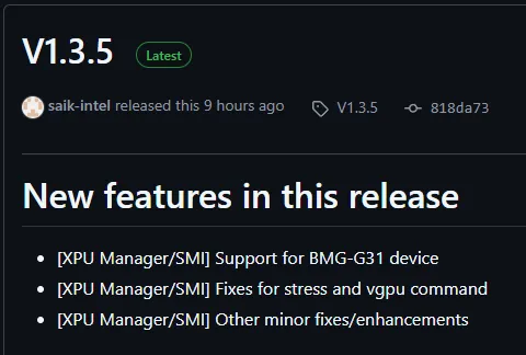在官方 1.3.5 版本日志中,英特尔明确加入支持 BMG-G31 芯片,确认了代号为“Big Battlemage”的大核心 GPU 芯片正处于活跃开发与驱动测试阶段。