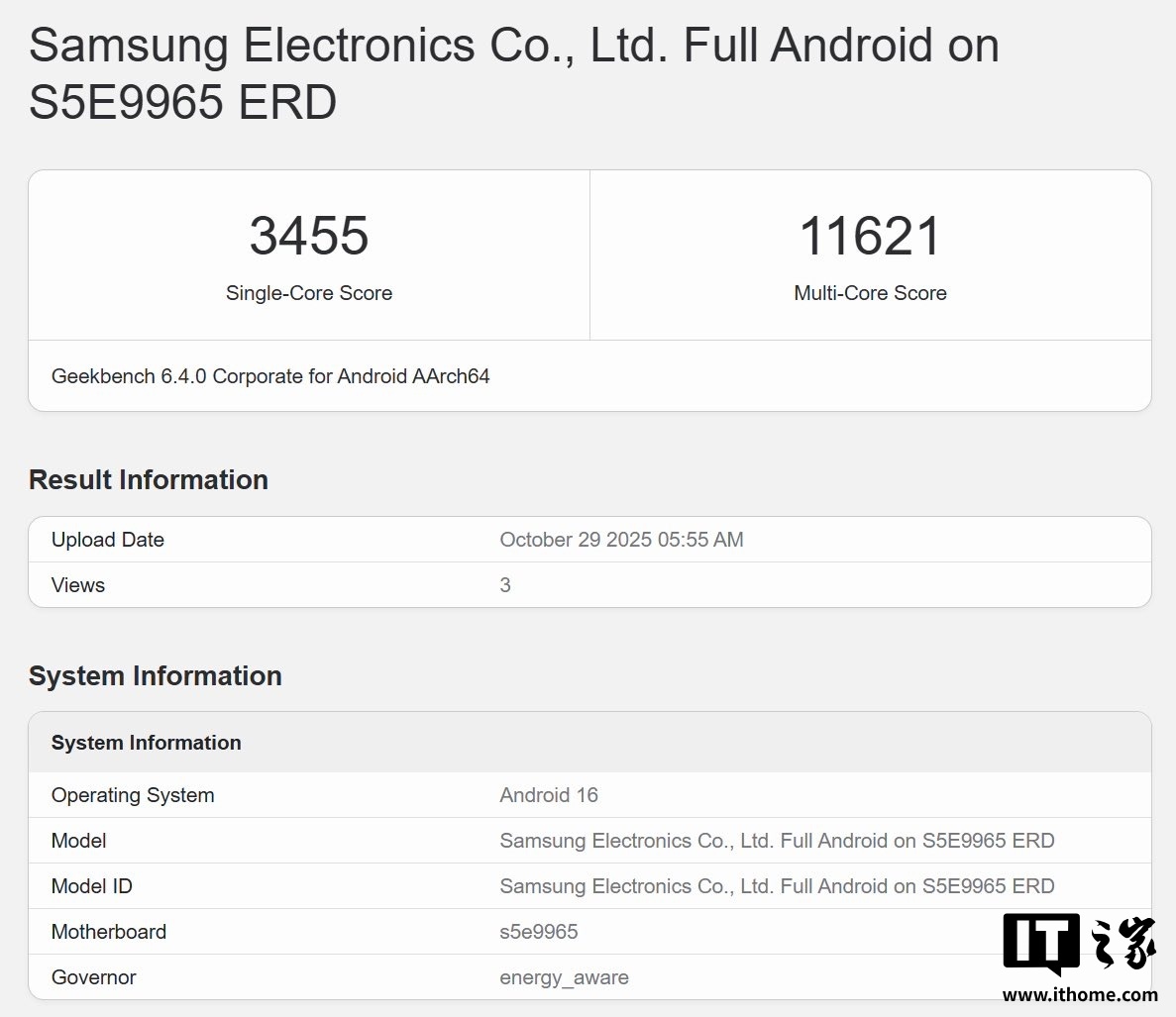 IT之家此前报道,三星 Exynos 2600 芯片多次现身 GeekBench 跑分库,单核得分最高 3455 分,多核得分达到 11621 分。