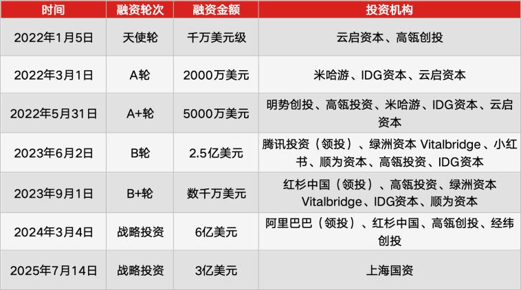 截至目前,公司共完成7 轮融资:腾讯领投2.5亿美元B轮,阿里随后完成 6亿美元战略投资;最近一轮则由上海国资出资 3亿美元,公司整体估值超过40亿美元(约 288 亿元人民币)。