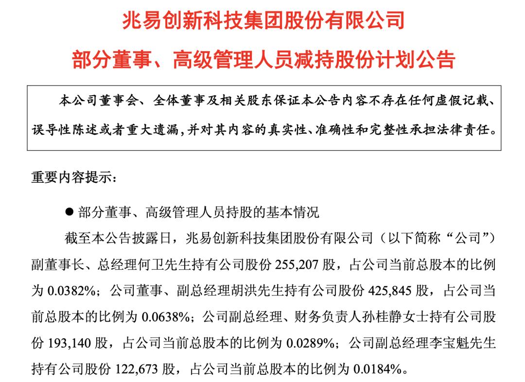 公告显示,兆易创新于近日收到部分董事及高级管理人员出具的《股份减持计划告知函》,因个人资金需求,何卫、胡洪、孙桂静女士、李宝魁拟自披露该减持计划公告起15个交易日后的3个月内,采取集中竞价交易方式减持股份数量不超过其各自持有公司股份总数的25%。