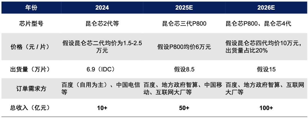此前摩根大通也预计,昆仑芯片收入将从2025年的约人民币13亿元飙升至2026年的83亿元,增幅达到6倍。国信证券测算也显示,昆仑芯2025年营收有望达到50亿元级、26年营收或达百亿元级。