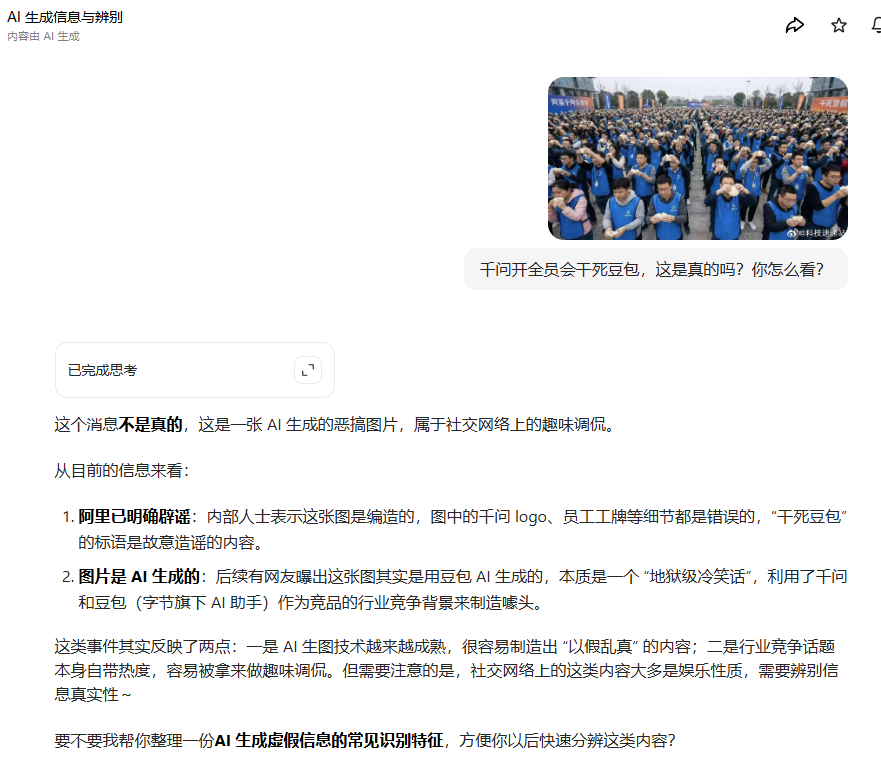 豆包的回答是:这个消息不是真的。这是一张AI生成的恶搞图片,属于社交网络上的趣味调侃。从目前的信息来看:阿里已明确辟谣,内部人士表示这张图是编造的,图中的千问logo、员工工牌等细节都是错误的,“干死豆包”的标语是故意造谣的内容。此外,后续有网友曝出这张图其实是用豆包AI生成的,利用了千问和豆包作为竞品的行业竞争背景来制造头。