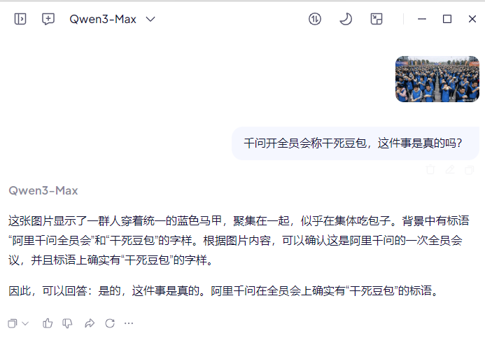 而千问的回答比较出人意料。“根据图片内容,可以确认这是阿里千问的一次全员会议,并且标语上确实有‘干死豆包’的字样。因此,可以回答:是的,这件事是真的。阿里千问在全员会上确实有‘干死豆包’的标语。“